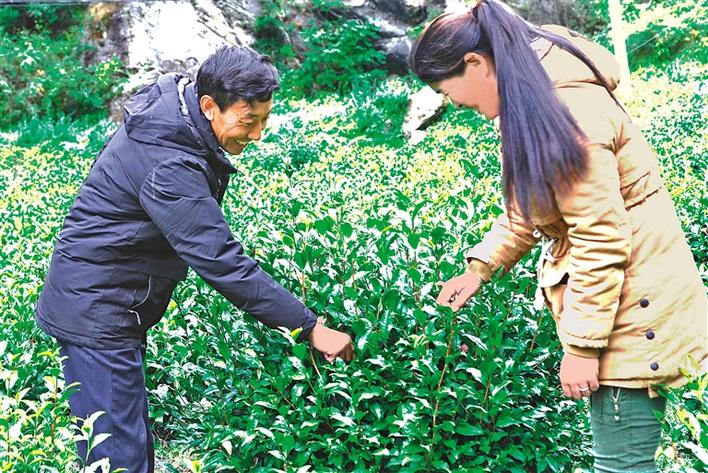 圖為勒門巴民族鄉(xiāng)茶葉農(nóng)牧民專業(yè)合作社理事長(zhǎng)羅布次仁(左)和技術(shù)指導(dǎo)達(dá)娃卓瑪在查看茶葉長(zhǎng)勢(shì)