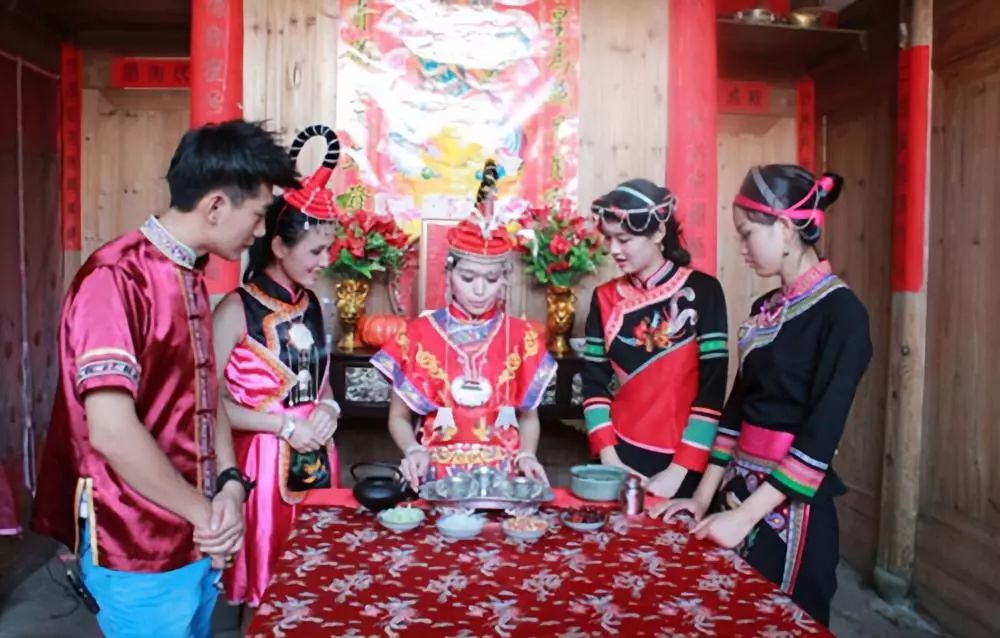 寶塔茶 畬族“寶塔茶”是福建福安畬族同胞在長期的生產(chǎn)生活中形成的一種獨(dú)具特色的婚嫁習(xí)俗。“寶塔茶”文化說的是,男方送來的禮品要一一擺在桌上展示。女方會(huì)取豬肉、禽蛋等過秤,男方一語雙關(guān)地問道:“親家嫂,有稱(有親)無?”親家嫂連聲答道:“有稱(有親)!有稱(有親)!”接著,女方用樟木紅漆八角茶盤捧出5碗熱茶,這5碗熱茶像疊羅漢式疊成3層:一碗墊底,中間3碗,圍成梅花狀,頂上再壓一碗,呈寶塔形,恭恭敬敬地獻(xiàn)給代表男方的“親家伯”品飲。親家伯品飲時(shí)用牙齒咬住寶塔頂上的那碗茶,以雙手挾住中間那3碗茶,連同底層的那碗茶,分別遞給4位轎夫,他自己則一口飲干咬著的那碗熱茶。這簡直是高難度的雜技表演!要是把茶水濺了或倒了,不但大伙無茶喝,還會(huì)遭到“親家嫂”的奚落。在獻(xiàn)茶時(shí),通常還有一段對(duì)歌習(xí)俗。