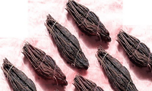 龍須茶具有工藝晶的性質(zhì),它對外形的要求極高,茶束的外觀形狀,必須滿像蘸墨汁而直立的短毛筆,色呈墨綠,長約二寸八分,最大處周圓約二寸半,不宜過大或過小,四十至五十個(gè)干茶束約重一斤。茶束分單束和雙束兩種,均扎以鮮艷的紅、綠絲線。