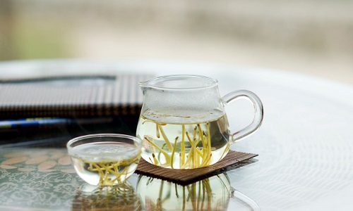 金銀花茶屬于花茶類,是用優(yōu)質(zhì)綠茶為素坯、加以新鮮金銀花,按金銀花茶窨制工藝窨制而成。夏季為金銀花的采摘期,花初開時(shí)為純白色,翌日變?yōu)辄S色,香氣逐漸散失,因此以開花當(dāng)天采摘最好。