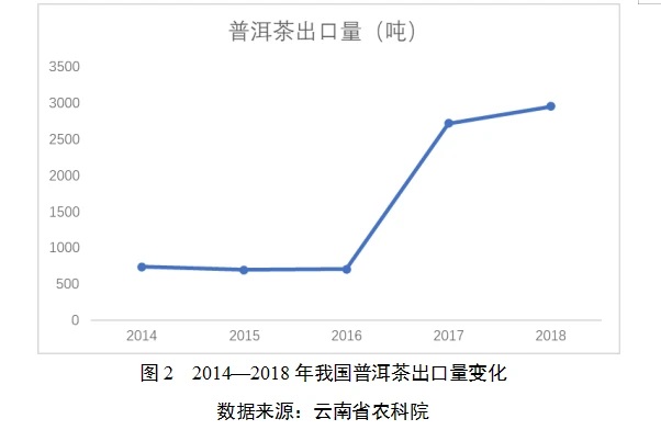 (四)出口國(guó)別多元化。2017年以來,我國(guó)普洱茶出口量較2014—2016年顯著增加,并呈繼續(xù)增加趨勢(shì)。2017年,我國(guó)普洱茶出口量2717.3噸,2018年我國(guó)普洱茶出口量2953.5噸。