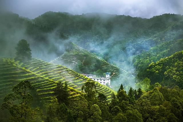 合水鎮(zhèn)鐵山茶場(chǎng)漫山遍野的茶樹(shù)沿著梯田整齊排列,煥發(fā)著勃勃生機(jī) 高訊攝