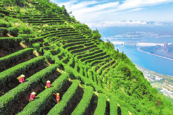 宜昌市夷陵區(qū)三斗坪鎮(zhèn)黃牛巖農(nóng)民利用梯田建設(shè)青云頂茶山小鎮(zhèn),發(fā)展農(nóng)旅融合產(chǎn)業(yè),讓游客體驗(yàn)茶文化、觀賞大壩勝景。(湖北日?qǐng)?bào)全媒記者 陳勇 攝)