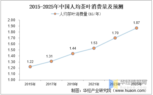 茶始終是中國消費者現(xiàn)制飲料消費的最大品類,茶葉消費市場規(guī)模依然遠(yuǎn)高于近年來在中國快速增長的咖啡市場:2019年中國茶葉銷售額達(dá)2740億元,遠(yuǎn)高于咖啡678億元的市場規(guī)模。從人均茶葉消費量來看,2015-2019年人均消費量持續(xù)增長,由1.22千克/年增長至1.44千克/年,預(yù)計未來將維持增長態(tài)勢,2025年可達(dá)到1.87千克/年。
