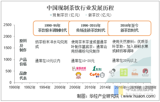 中國現(xiàn)制茶飲行業(yè)走過來三個階段:1990-1995的茶飲粉末調(diào)制時代;1996-2015年的傳統(tǒng)連鎖茶飲時代,以蜜雪冰城、一點點、COCO等品牌為代表;2016年至今的新茶飲時代,以奈雪的茶、喜茶、茶顏悅色等品牌為代表。