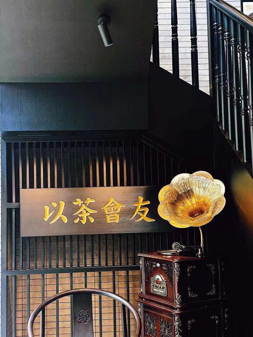 以茶會(huì)友的金字招牌上書(shū)“以茶會(huì)友”招徠過(guò)往賓客,配上傳統(tǒng)八仙桌與復(fù)古留聲機(jī)。在這個(gè)空間中喜茶靈感與廣式茶樓印象交融,傳統(tǒng)元素在打散重組中收獲新意。